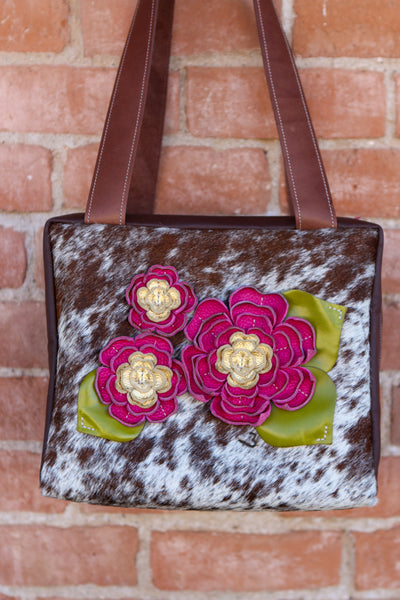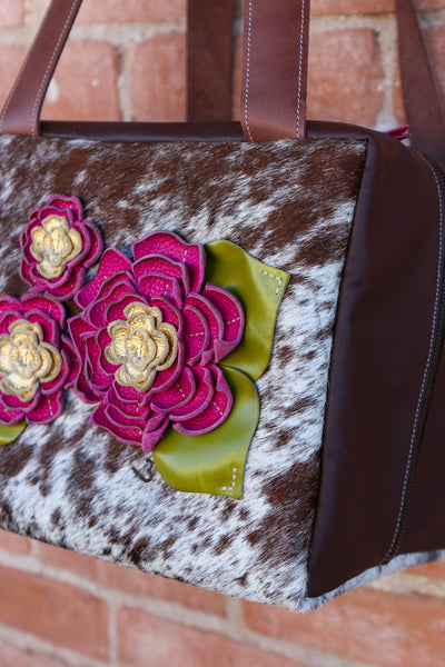 Cowhide Travel Case with Leather Sides and Leather Flowers and Leaves.